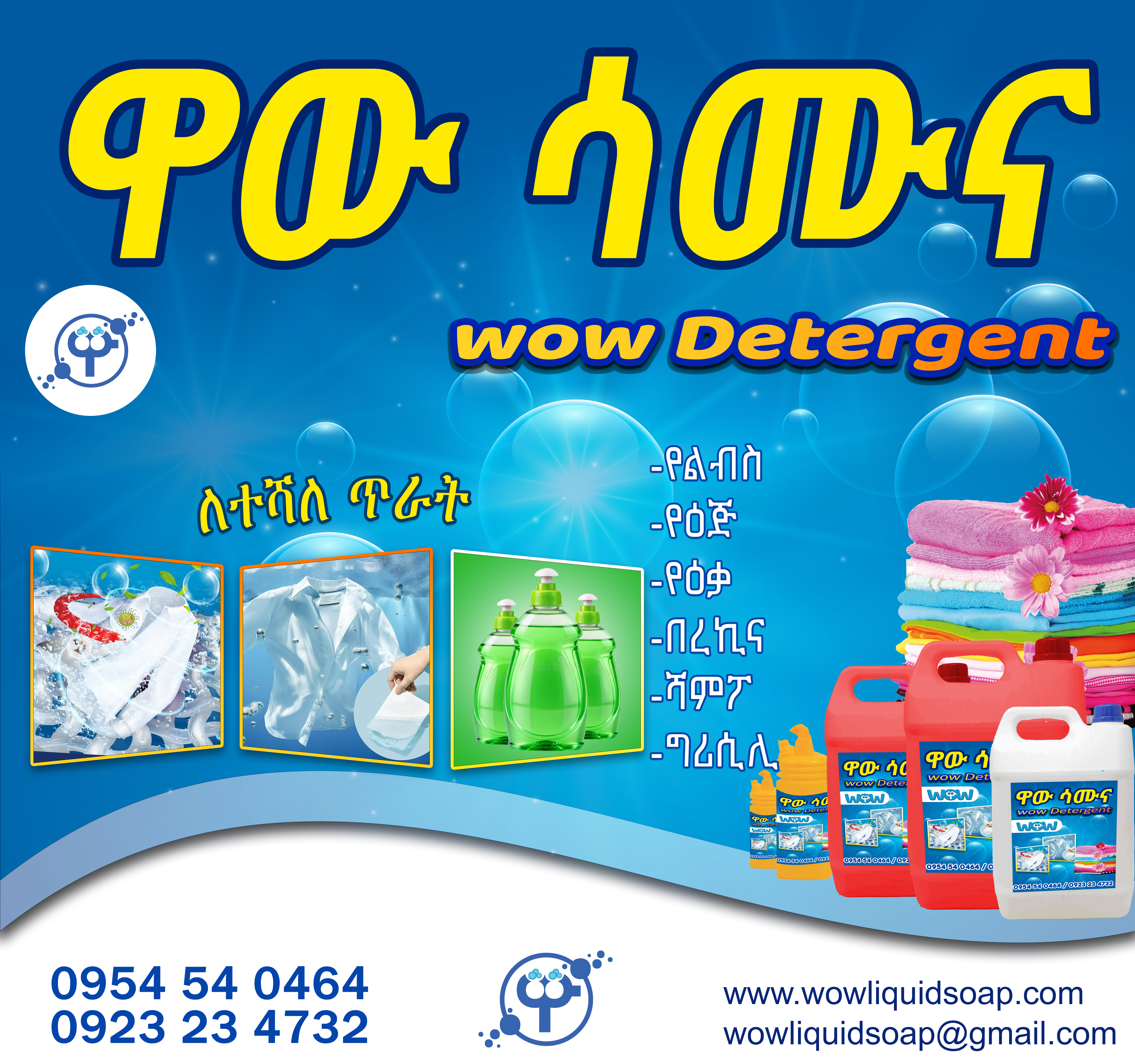 WOW Soap & Detergent Manufacturing Company is a proudly Ethiopian manufacturer based in Bahir Dar, producing high‑quality cleaning and personal care products for households, retailers, distributors, and institutions. We specialize in reliable, affordable, and effective products including laundry soap, dishwashing liquid, hand soap, shampoo, and bleach. To ensure smooth supply, we provide free delivery services and operate three distribution branches to serve our partners efficiently.